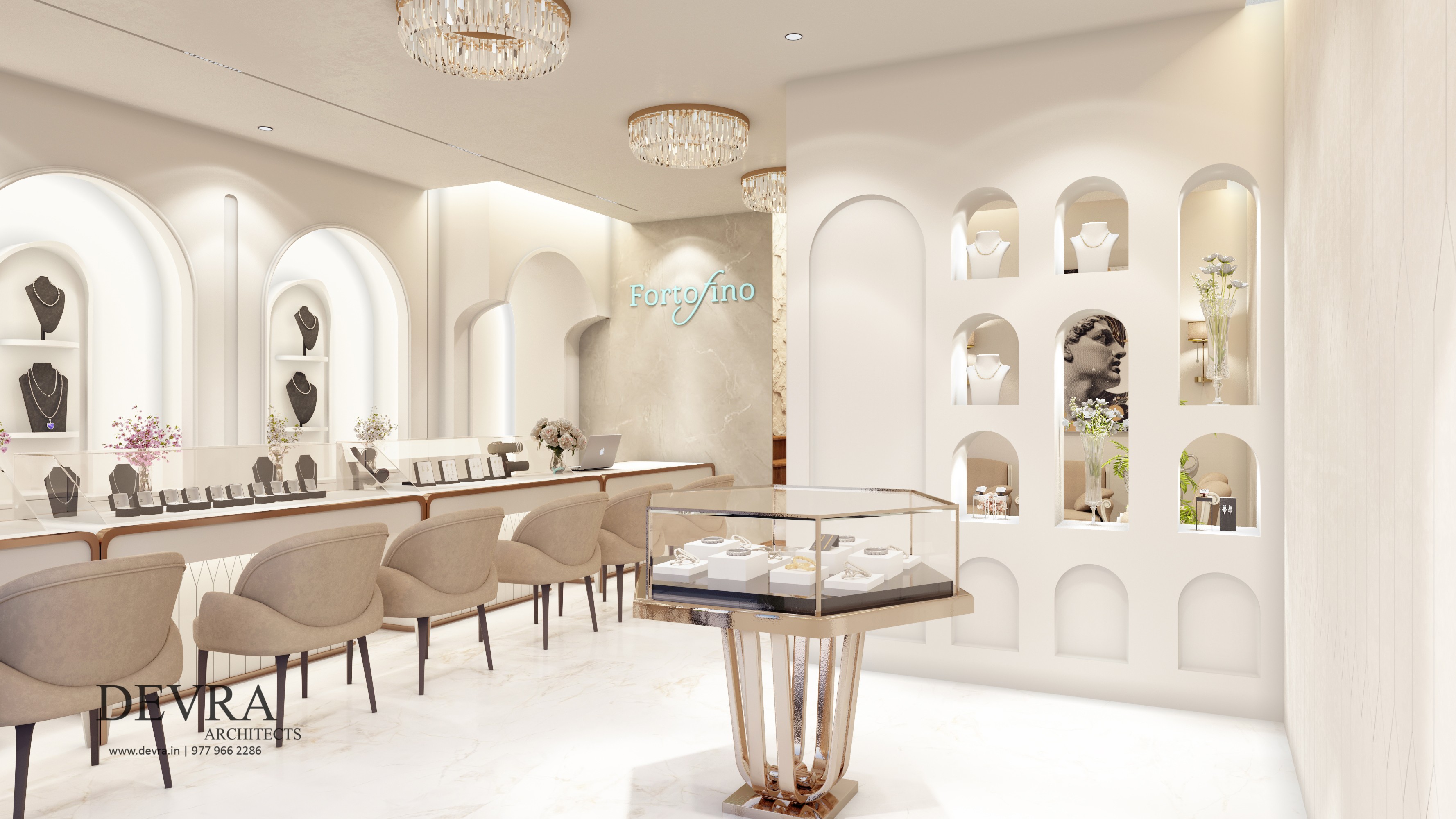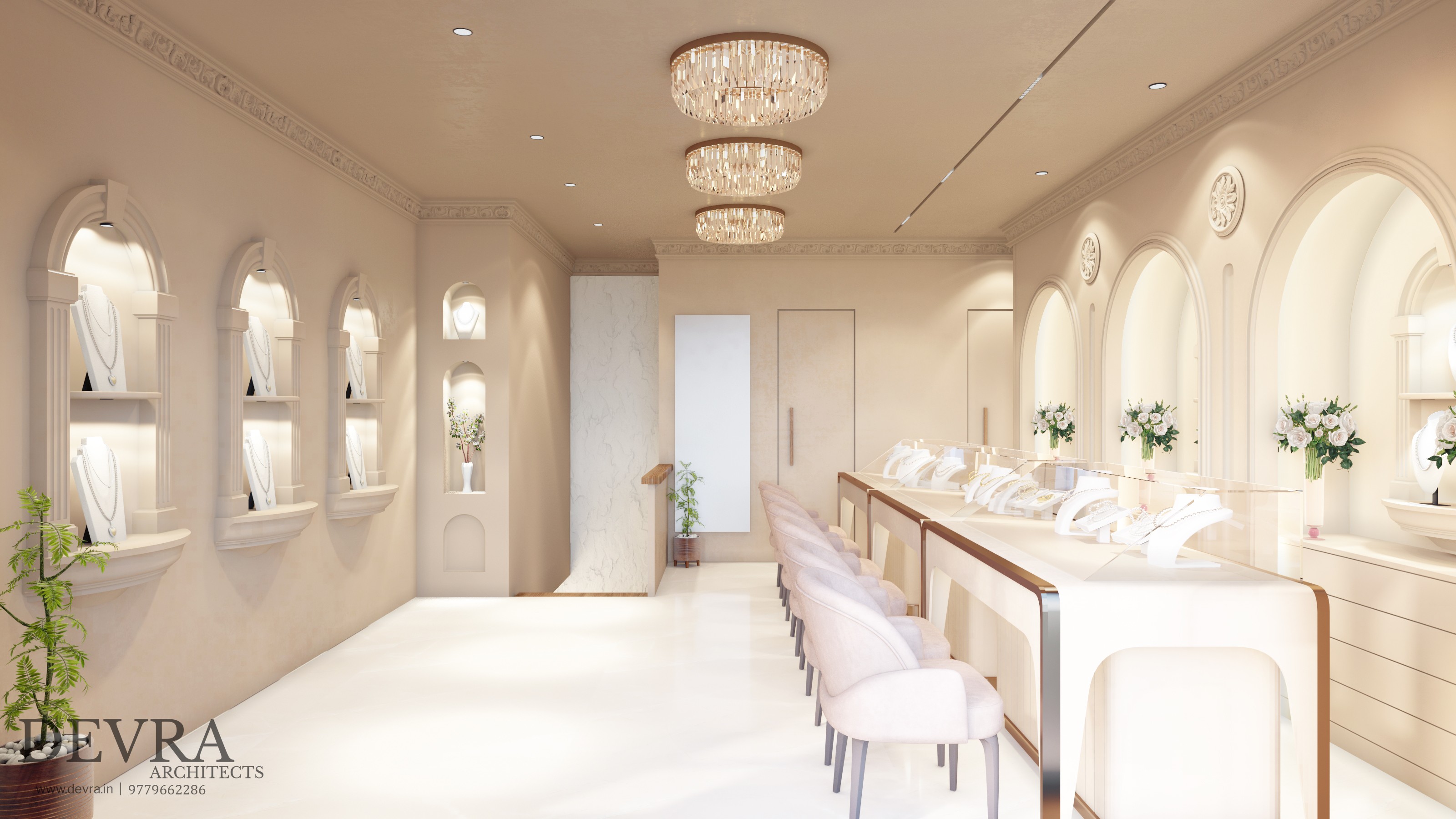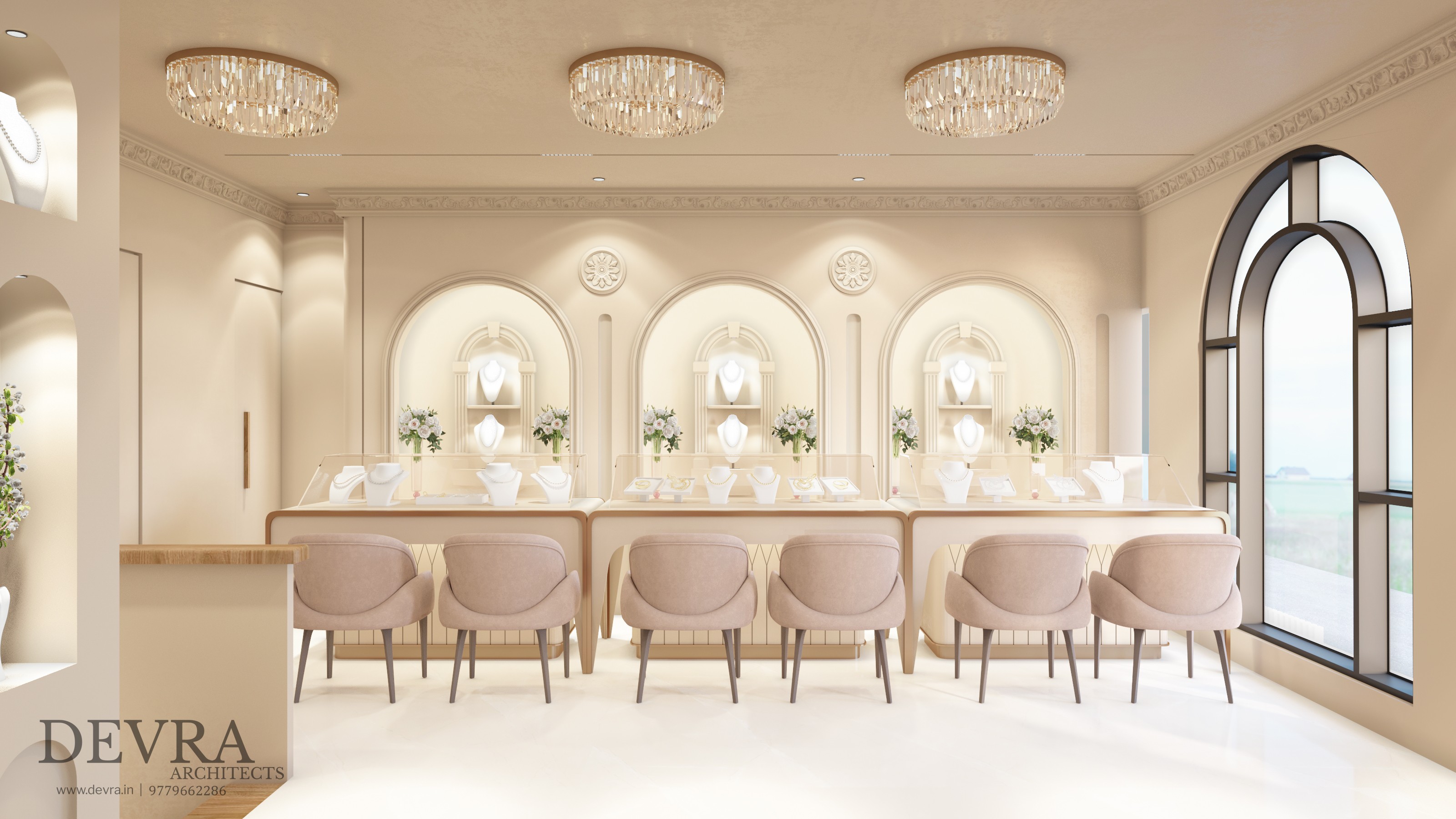 A refined boutique interior crafted in soft neutrals, sculpted arches, and warm lighting—creating an atmosphere of quiet luxury. Every display, surface, and detail is designed to elevate the jewellery itself, offering an experience that feels exclusive, graceful, and timeless.