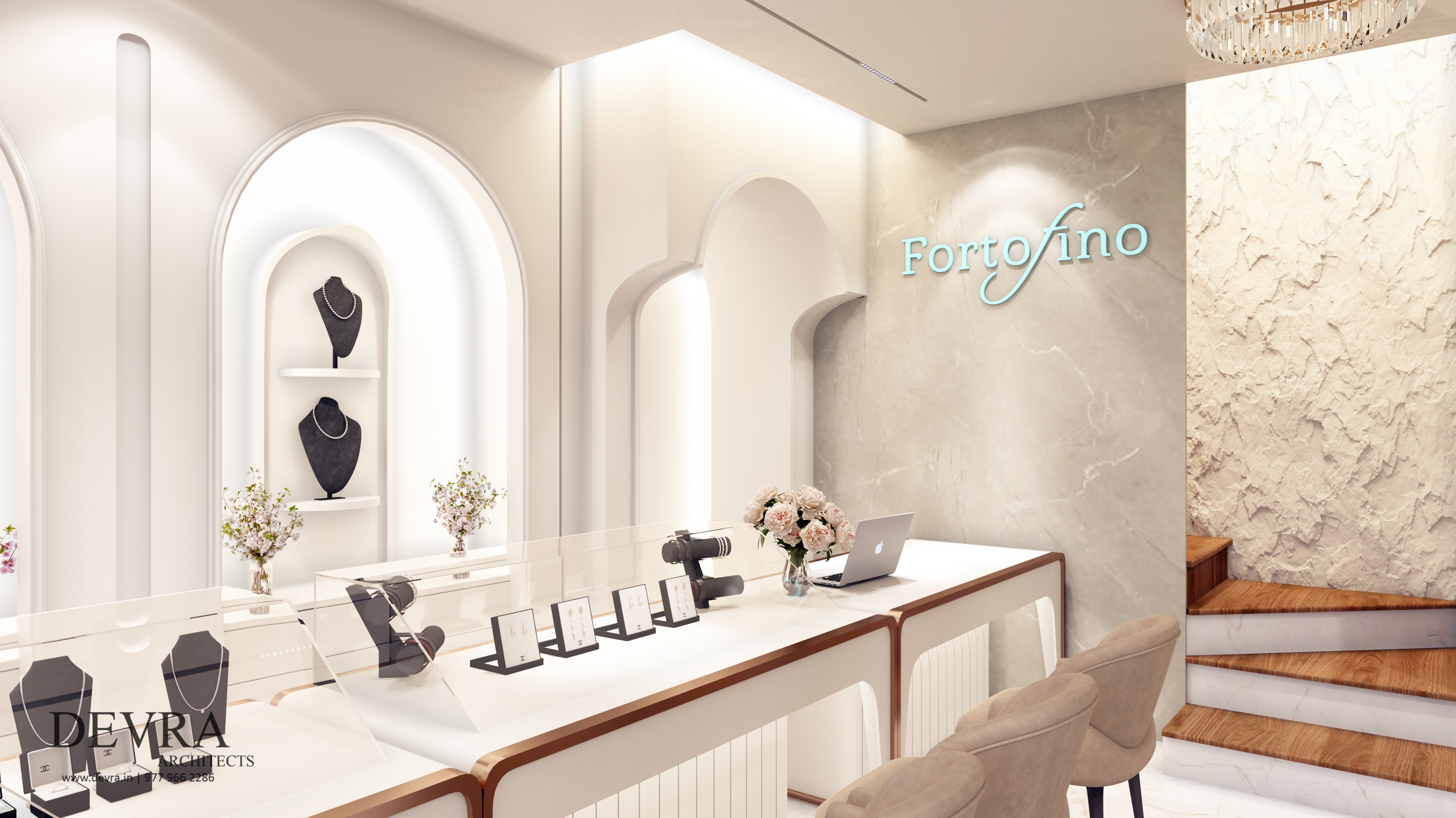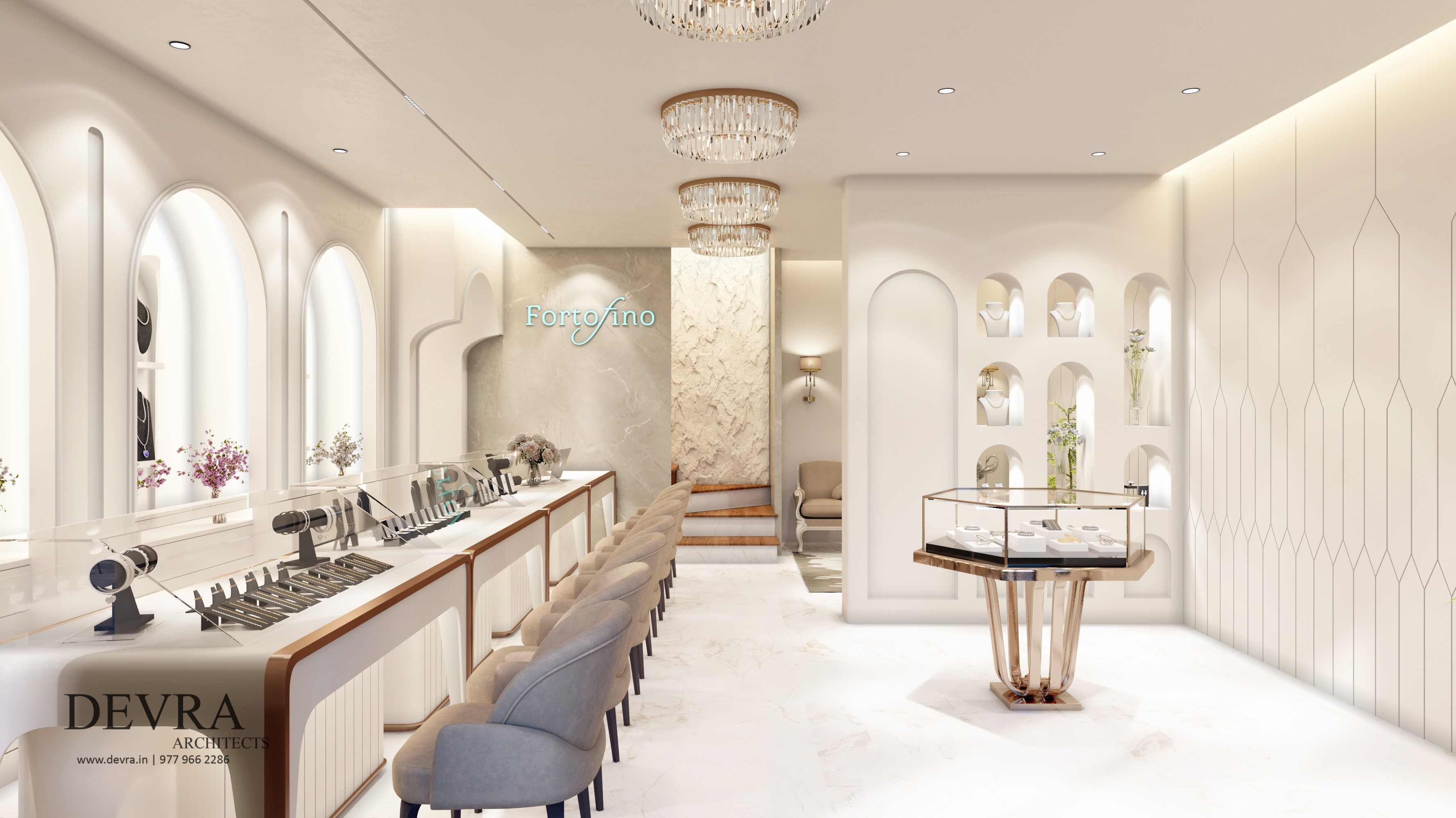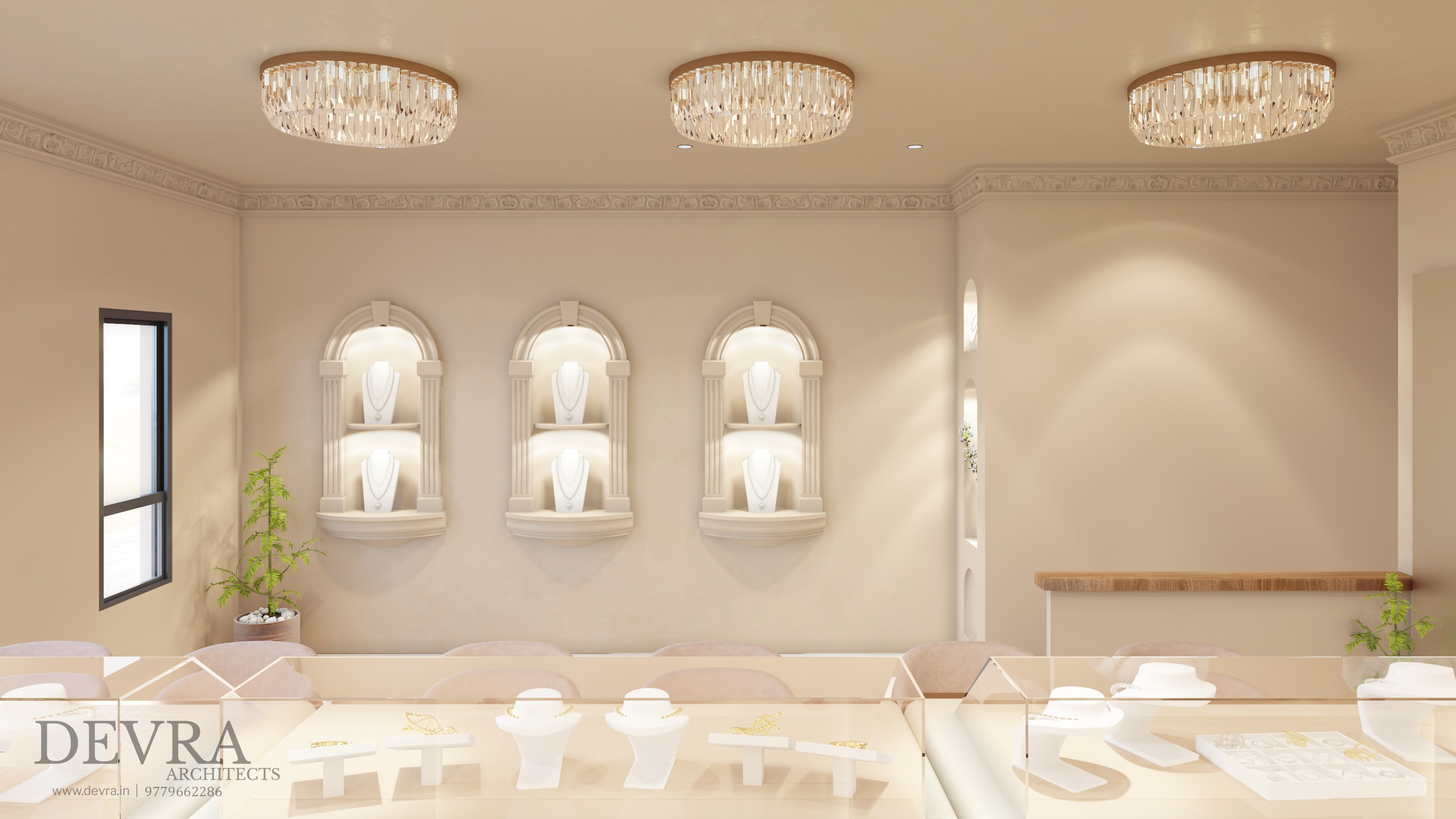 A refined boutique interior crafted in soft neutrals, sculpted arches, and warm lighting—creating an atmosphere of quiet luxury. Every display, surface, and detail is designed to elevate the jewellery itself, offering an experience that feels exclusive, graceful, and timeless.