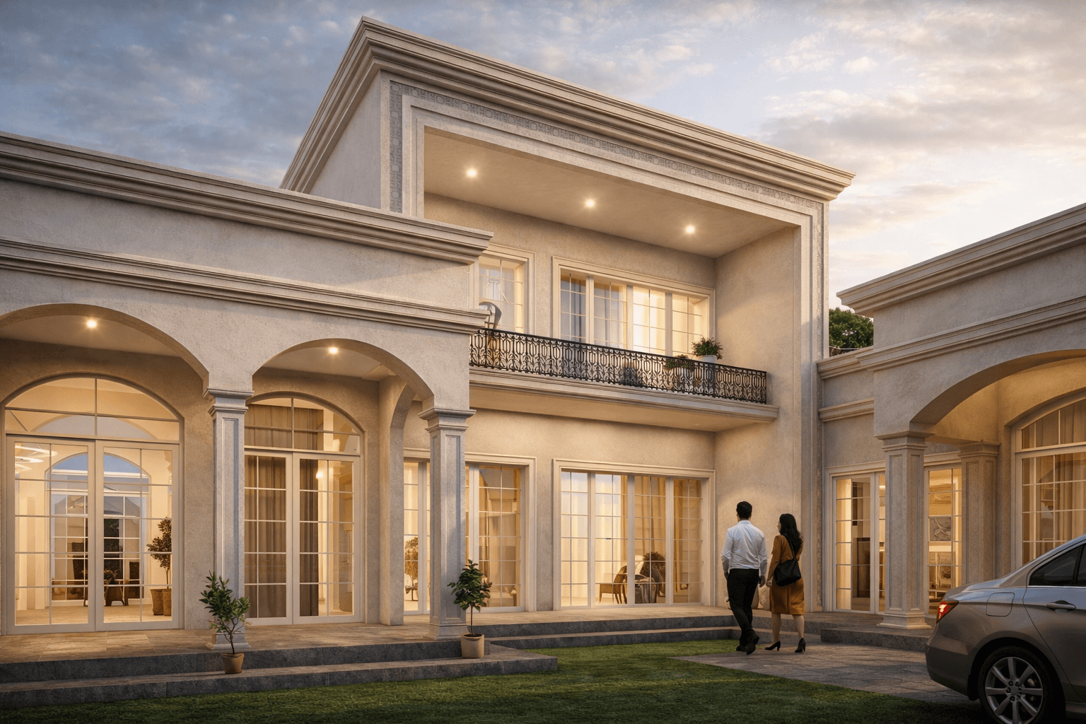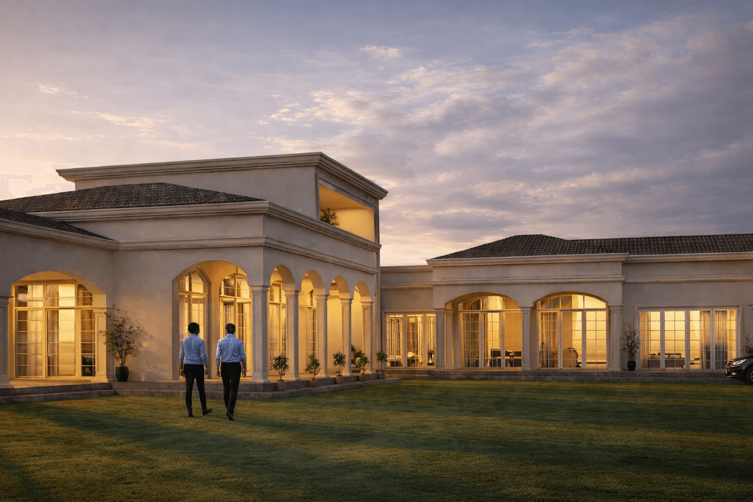 Warm interior lighting spilling through large glazed openings enhances the architectural depth, especially during dusk, giving the home a refined and inviting character. The design, often recognized among the best farmhouse expressions in India, blends classical detailing with modern openness, resulting in a space that feels grand, serene, and effortlessly livable.