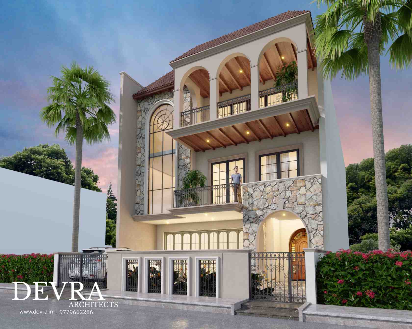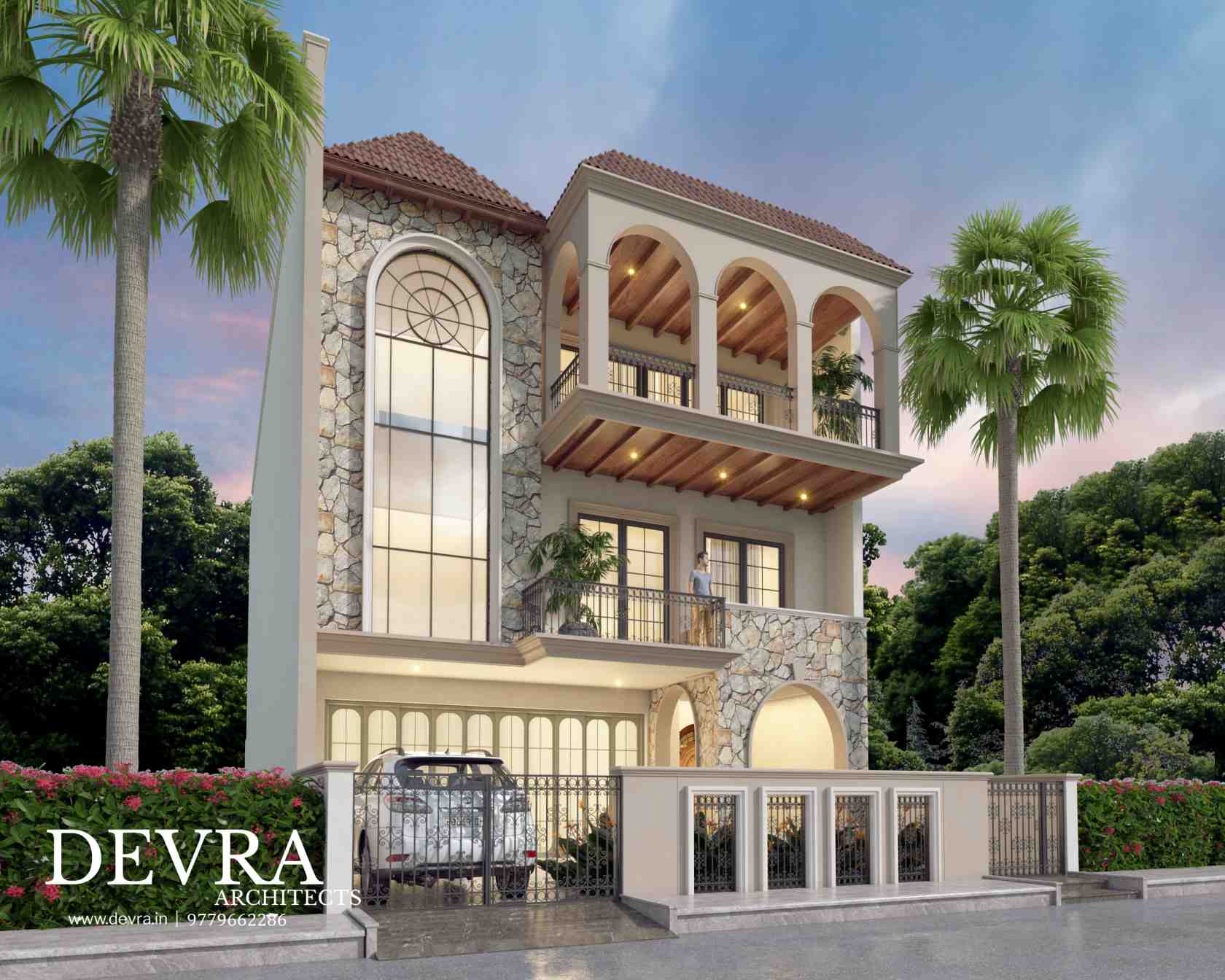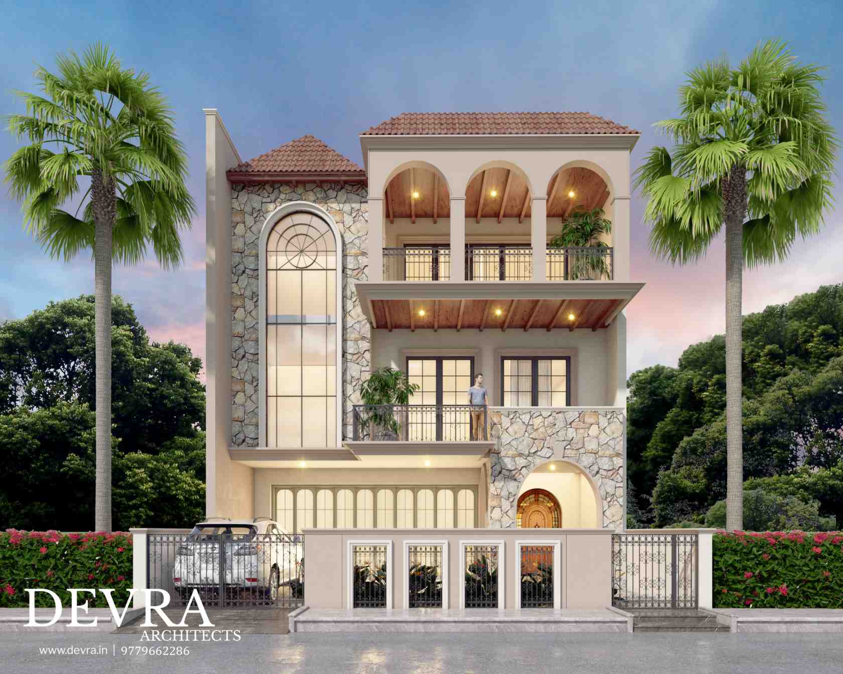 A Mediterranean heritage villa distinguished by arched openings, warm stucco textures, hand-carved stone details, and deep wooden balconies. The façade balances classical charm with refined proportion, creating a home that feels elegant, inviting, and timelessly rooted in coastal architecture.