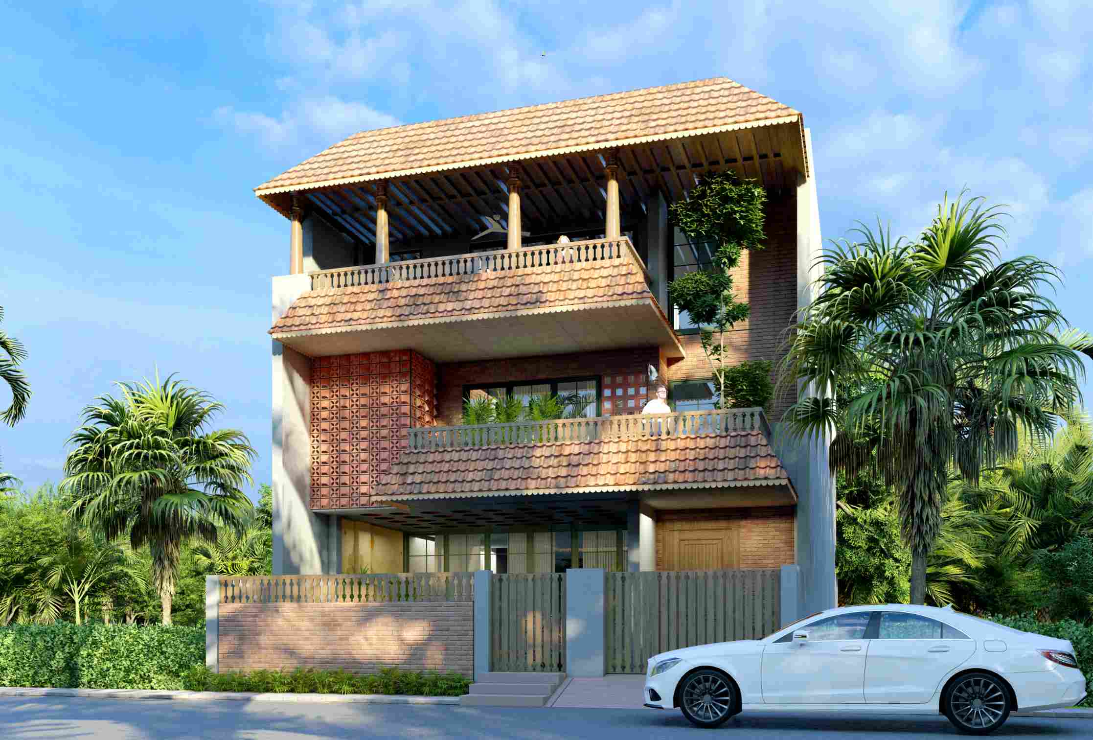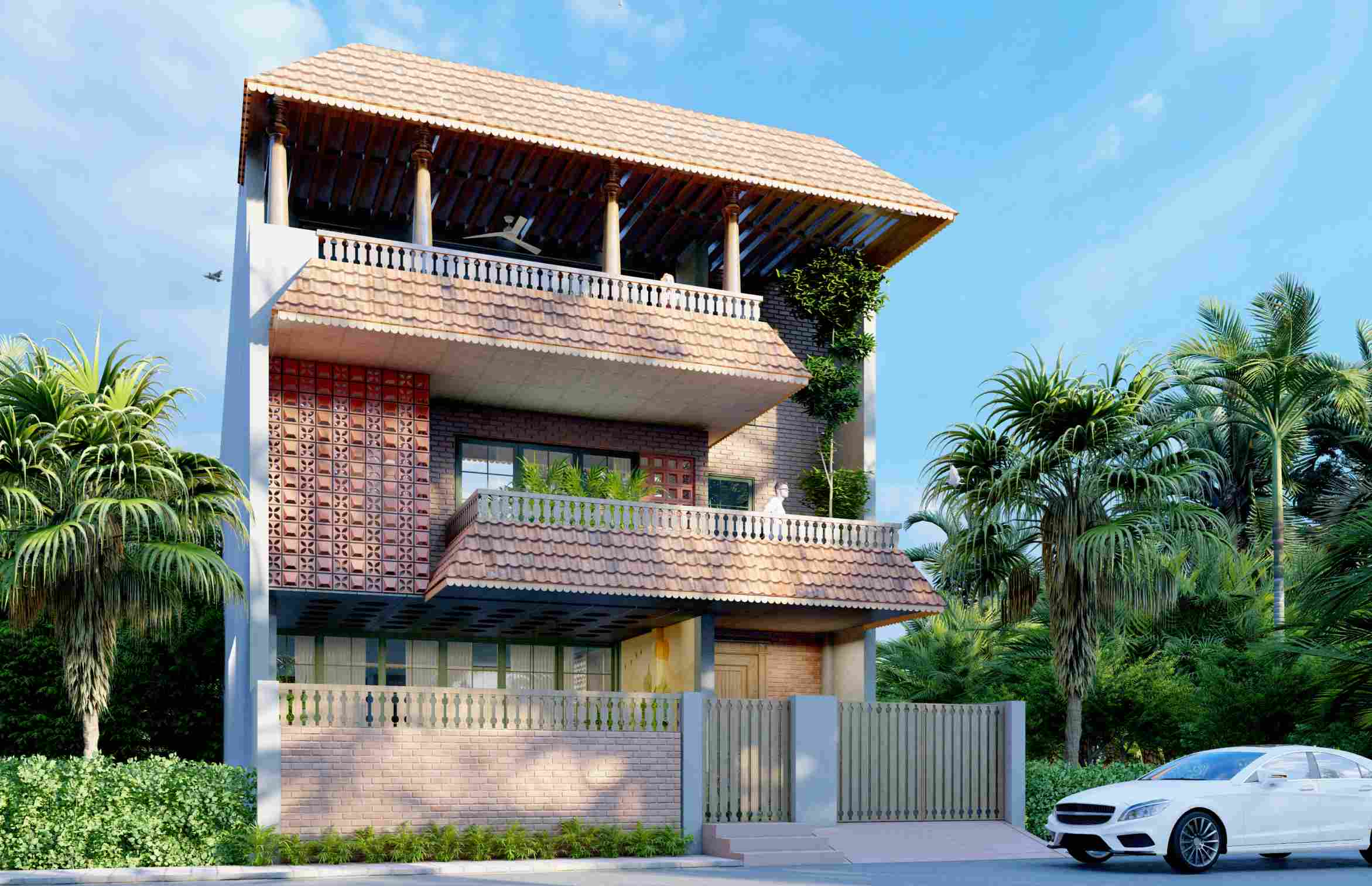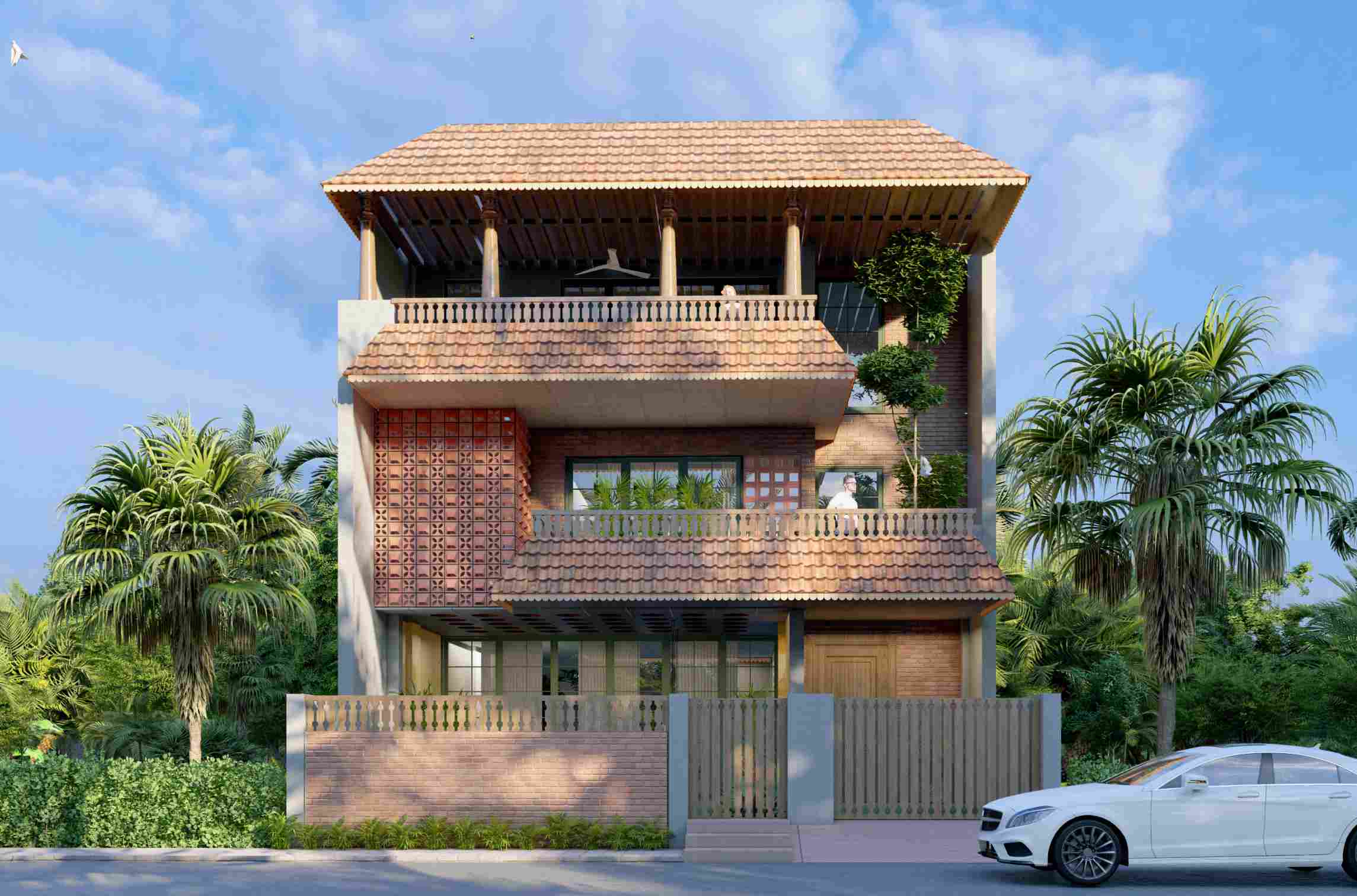 A tropical-rustic villa defined by deep clay-tile roofs, carved brick surfaces, and layered balconies that open to lush green views. The façade blends vernacular warmth with modern proportion, creating a home that feels rooted, timeless, and naturally welcoming.