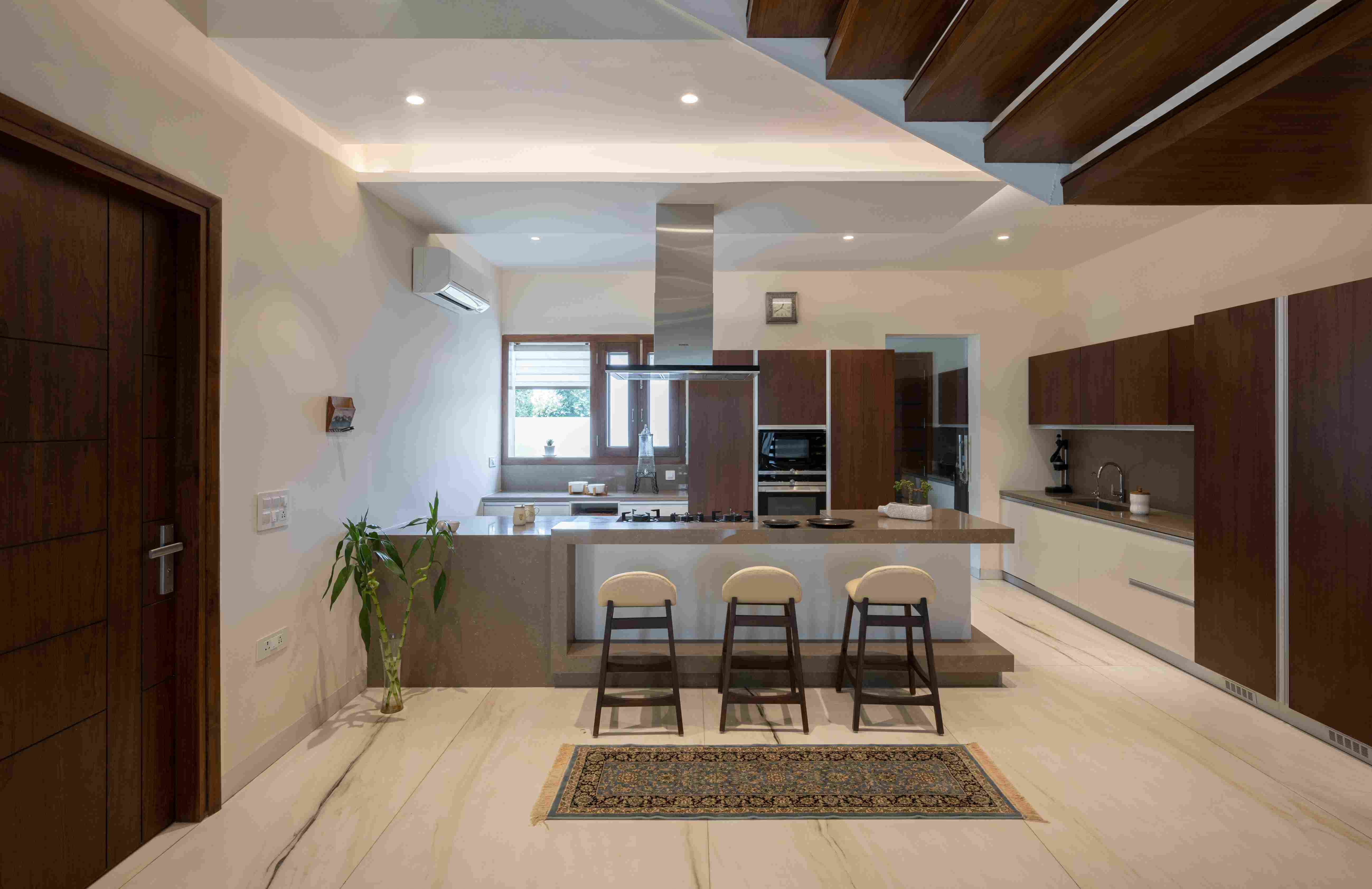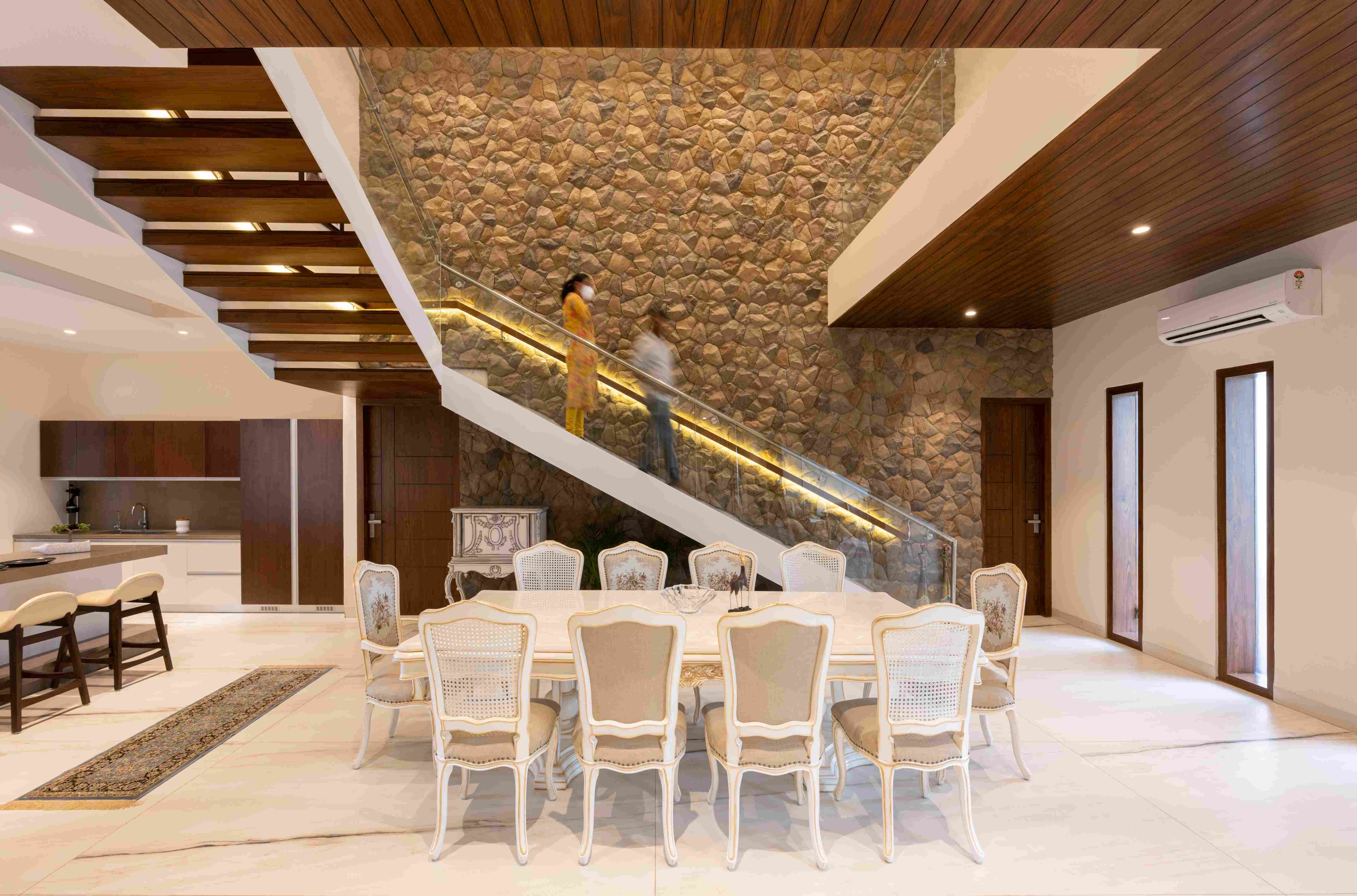 This home blends warm stone, clean modern lines, and generous glazing to create a calm, contemporary atmosphere. Inside, earthy materials and soft lighting shape inviting spaces that feel both refined and effortlessly livable.